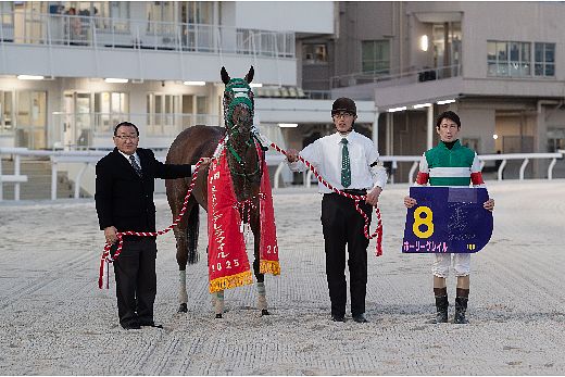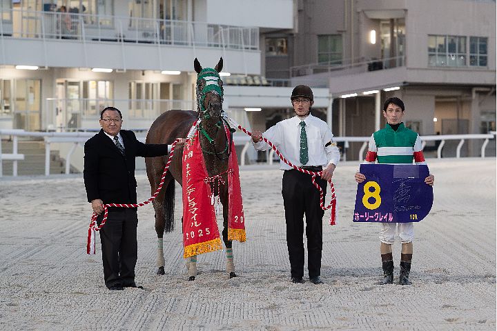 2025年『川崎競馬場、優秀競走馬の表彰』 26/2/26 2025年の川崎競馬を代表するにふさわしい成績を収めた競走馬を表彰する川崎競馬場所属優秀競走馬が2月26日に発表され、ホーリーグレイルが受賞いたしました。 本馬は4月に浦和競馬場で行われるしらさぎ賞を目標に調整を行っており、昨年以上の活躍に期待したいと思います。 ホーリーグレイル【川崎・内田勝義厩舎】 25年の主な勝ち鞍 東京シンデレラマイル(S3) ニューイヤーカップ(S3) 楠賞