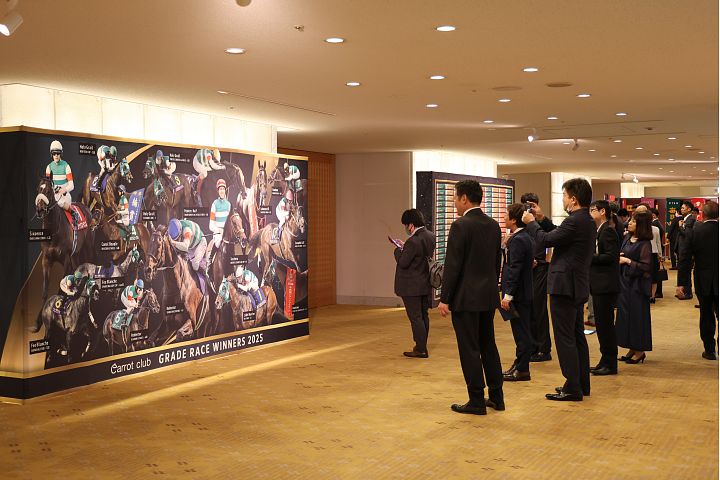 宴会場前のホワイエでは、2025年〜今春までに勝利した重賞レースの優勝記念品(優勝レイと馬服)と、記念撮影ができる自立式パネルを展示。2025年の全重賞レース勝ち馬が載っているものと、全勝利馬名が表記されているテキストデザインのもの、2種類で、皆さまご自身の愛馬を探したりしながら、楽しんでいらっしゃるご様子でした。
