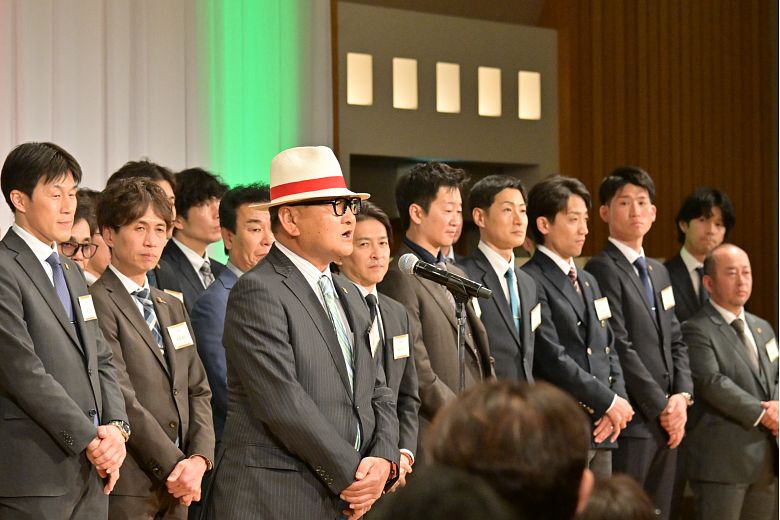 宴会の終盤では、ご来場の全調教師の皆様にご登壇いただきました。代表してご挨拶いただいたのは、矢作芳人調教師。その後、石坂公一調教師、清水久詞調教師、藤原英昭調教師、藤岡佑介調教師、福永祐一調教師、小林真也調教師まで順々に、クラブ所属馬にまつわるエピソードをお話しくださり、会場の皆様は熱心に耳を傾けていらっしゃいました。